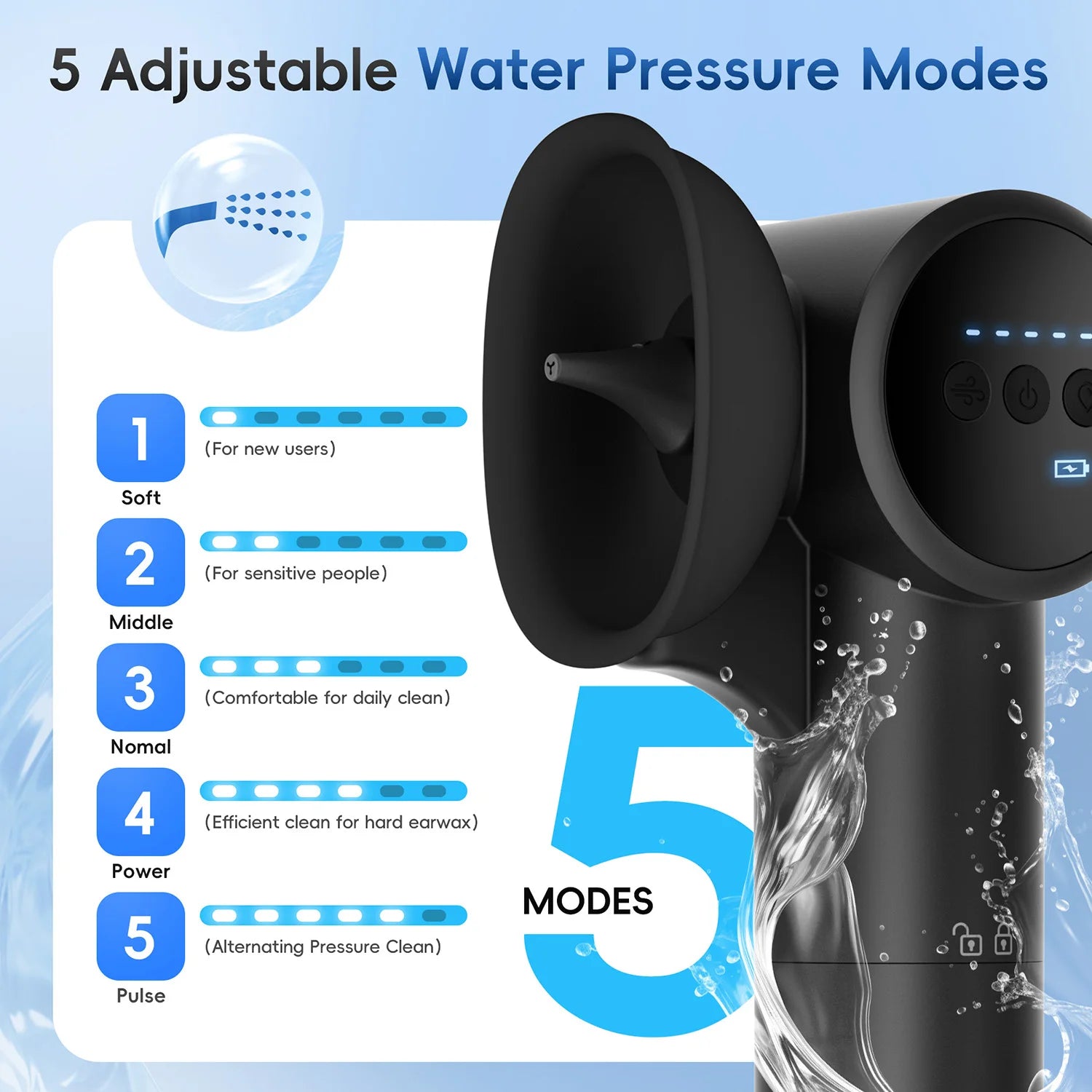 Our electric ear cleaner offers five pressure settings — Normal, Gentle, Strong, Ear Bath, and Pulse — to ensure a thorough rinse while protecting your ear canal. Simply choose the mode that’s most comfortable for you for a safe and effective clean.